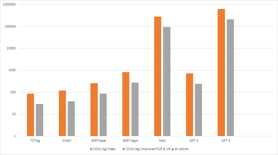 | Model | CO2e (kg) base | CO2e (kg) improved PUE | CO2e (kg) UK grid carbon | CO2e (kg) both |